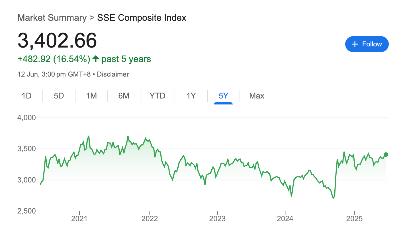 The shanghai composite index returned a total of 16.56% over the last 5 years (2020-2024). The index grew by 3.11% p.a