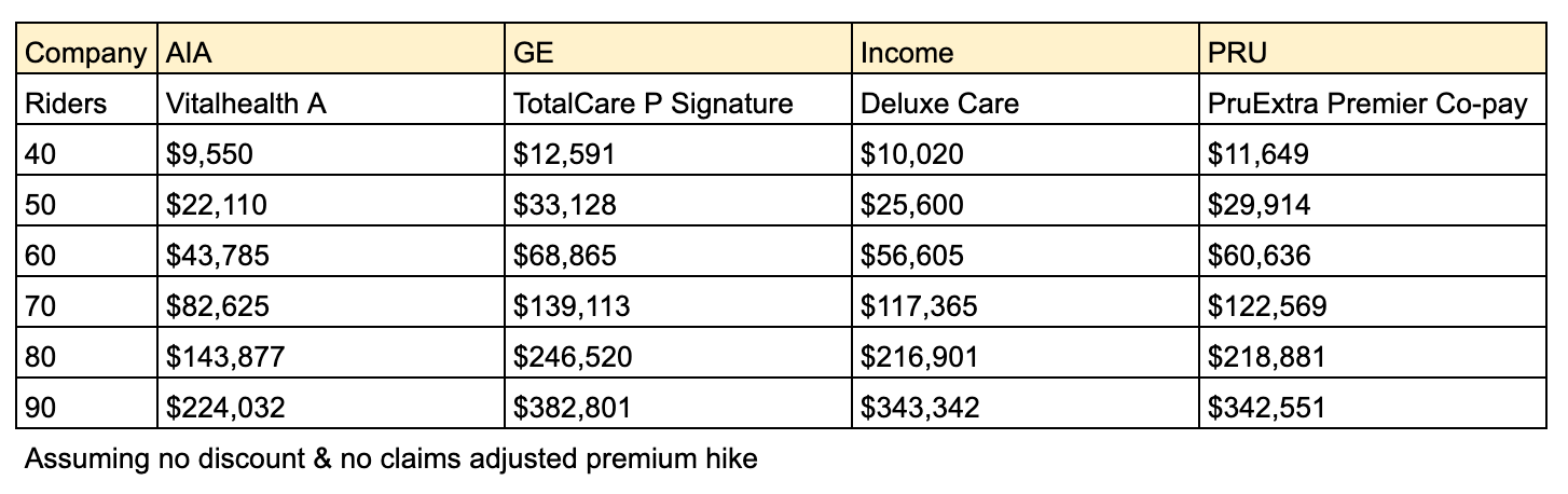 Take a look at the cumulative premiums for the riders of our 4 major IP insurers. These figures are obtained from the insurers' website as of June 2025.