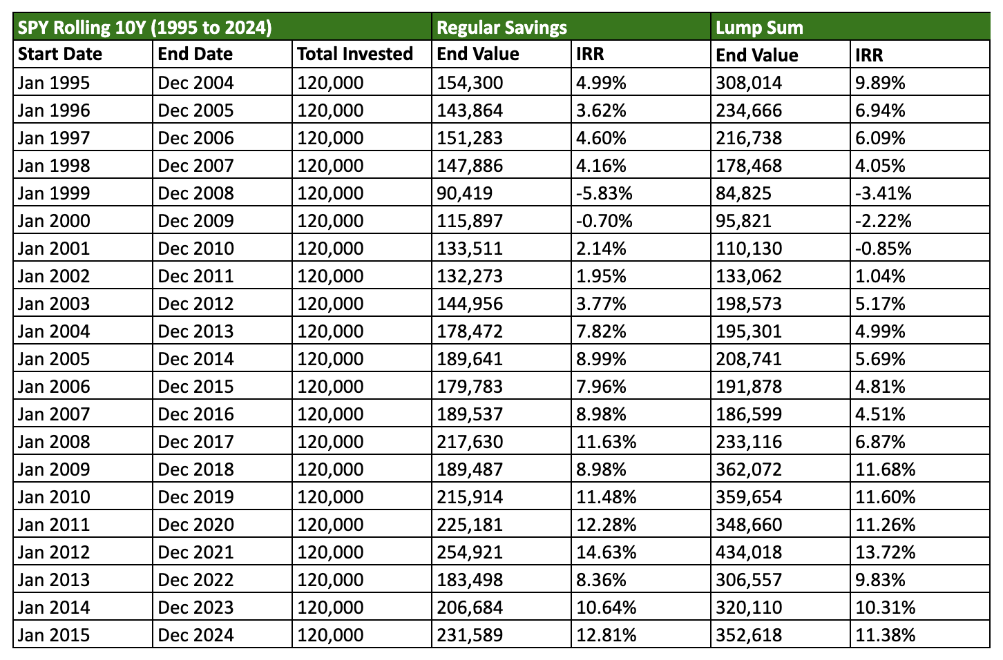 For period between 1995 to 2024. The backtested result shows the median Regular Savings return being 7.96% p.a
