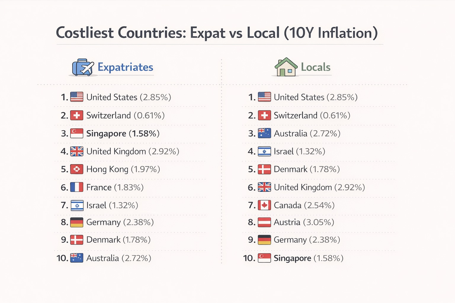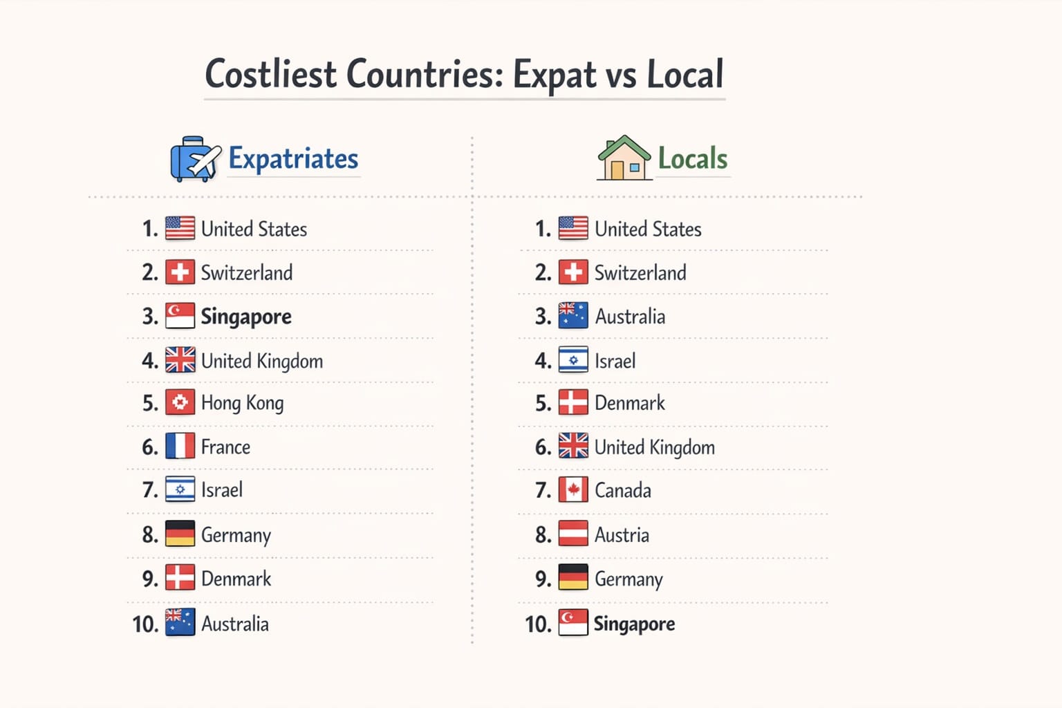 Let's say we rank the countries based on the position of their most expensive city. Singapore will rank 3rd in the world for expats and 10th for locals.